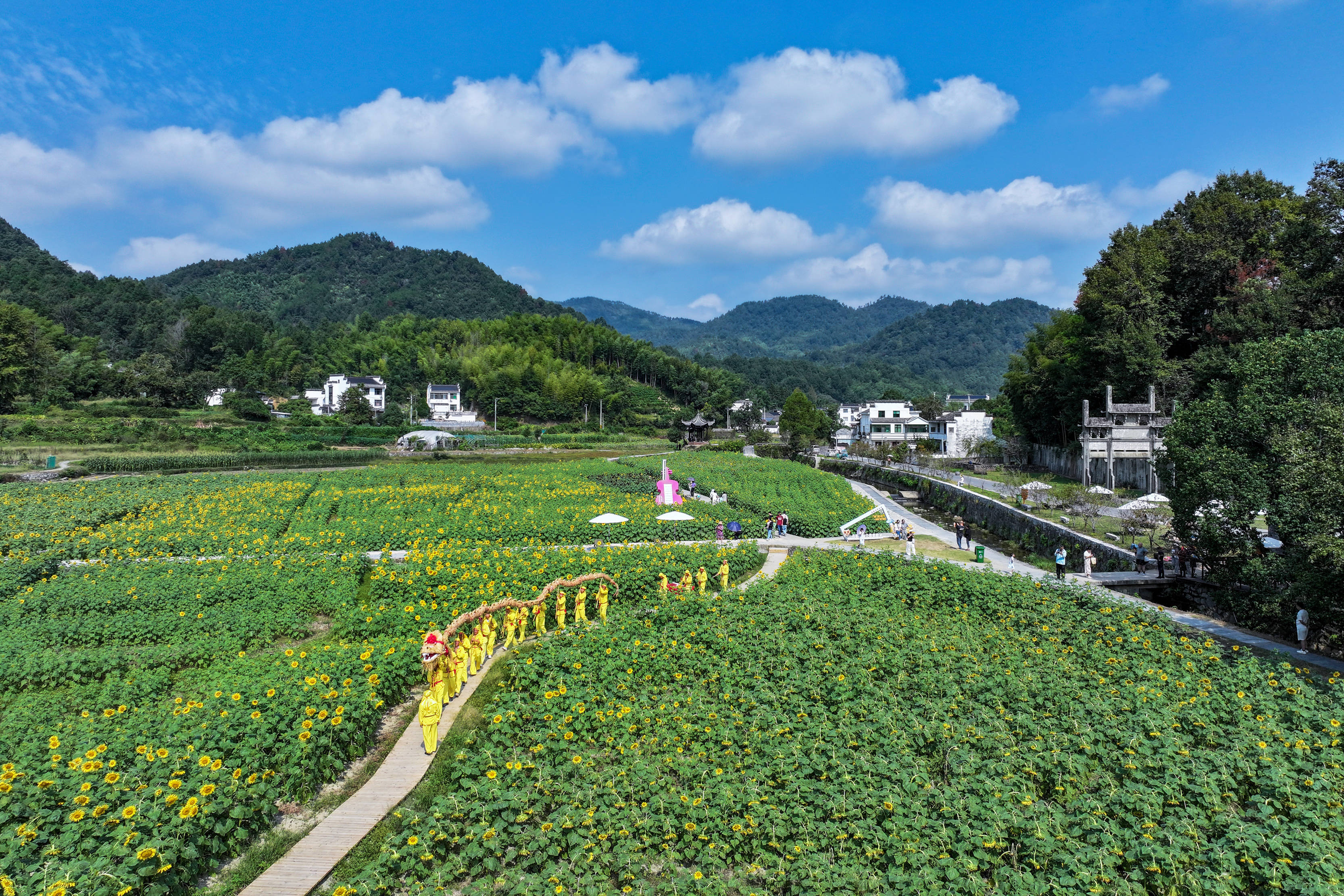 10月4日拍摄的蜀源村“舞草龙”活动(无人机照片)。 新华社发(樊成柱 摄)“蜀源草龙”是黄山市市级非遗项目