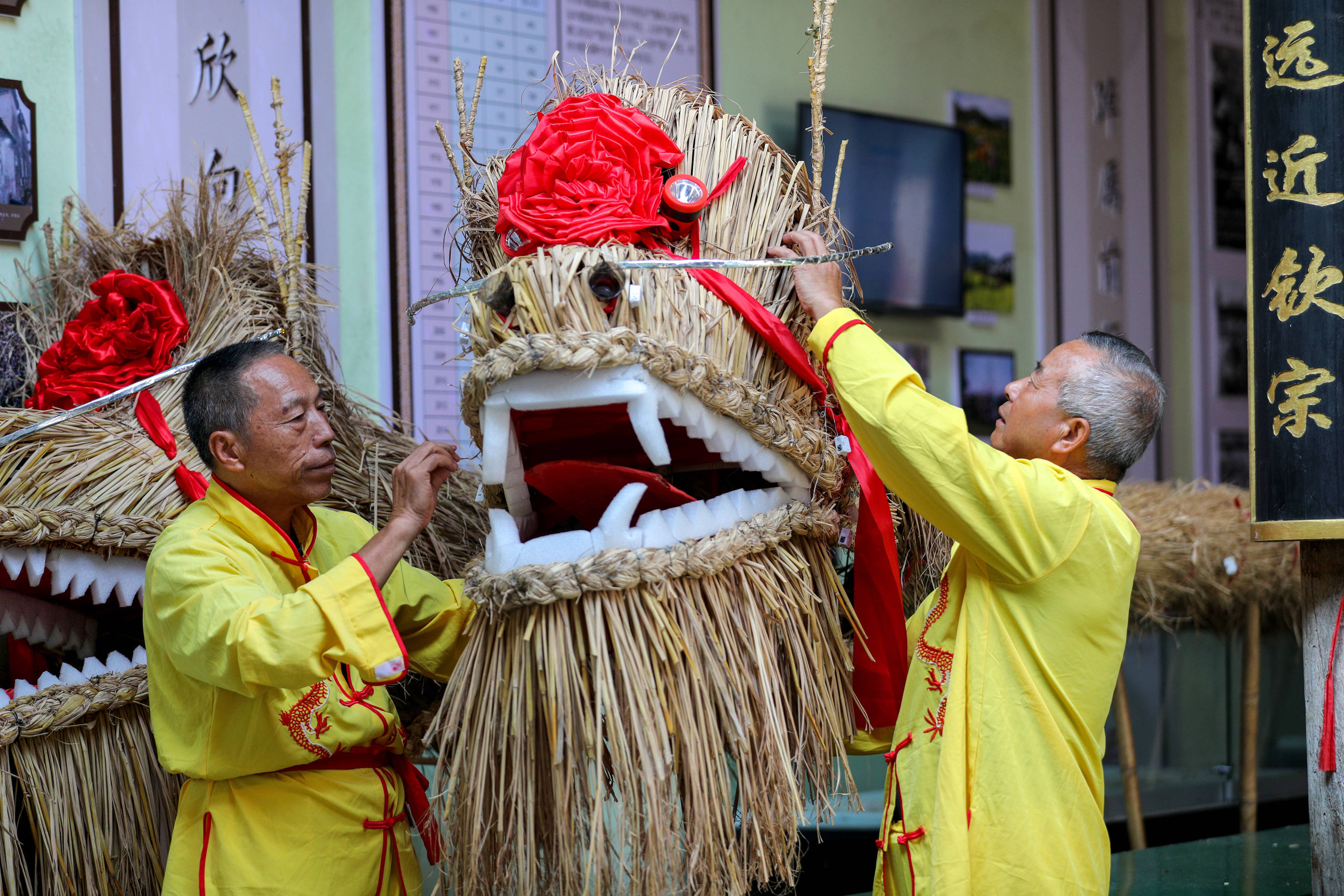 10月4日,“蜀源草龙”非遗项目传承人鲍观金(左)和村民检查编织完成的草龙。新华社发(樊成柱 摄)锣鼓声起